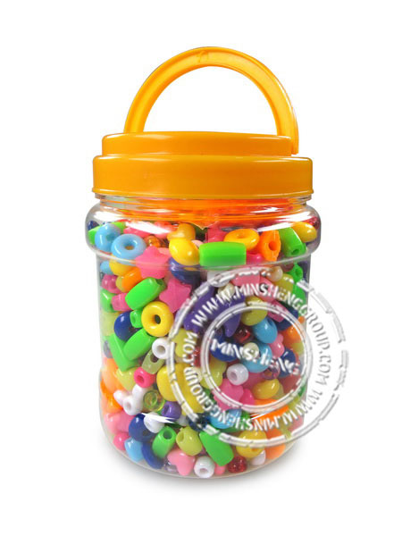 杂款彩色塑胶珠入PET桶。